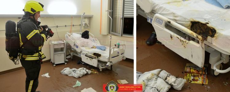 Ein geistig verwirrter 75-jähriger Patient hat die Matratze und Teile der Bettdecke seines im Bett liegenden Zimmernachbarn in Brand gesetzt. Durch die ausgelöste Brandmeldeanlage und des fast zeitgleich gedrückten Notrufknopfes durch den Patienten, wurde das diensthabende Personal auf die Situation aufmerksam. Geistesgegenwärtig löschte eine Krankenschwester die Flammen mit Wasser. Anschließend wurde der augenscheinlich unverletzte nicht gehfähige Patient in ein anderes Zimmer verlegt. Der zweite sich in dem Zimmer befindliche verwirrte Patient wurde mit Hilfe der Feuerwehr samt Bett auf den Flur geschoben, vom Klinikpersonal übernommen und durch Medikamente ruhig gestellt. Der Angriffstrupp kontrollierte das Bett auf mögliche Glutnester mit der Wärmebildkamera ohne Feststellung ab. Parallel wurde die Belüftung der Station mit einem Überdrucklüfter vorbereitet. Weitere Patienten der Station waren durch den Vorfall nicht betroffen. Durch das rechtzeitige und beherzte Handeln des Personals konnte Schlimmeres verhindert werden. Die Polizei hat noch in der Nacht die Ermittlungen zur Brandursache aufgenommen (Ergebnis siehe erste Satz).