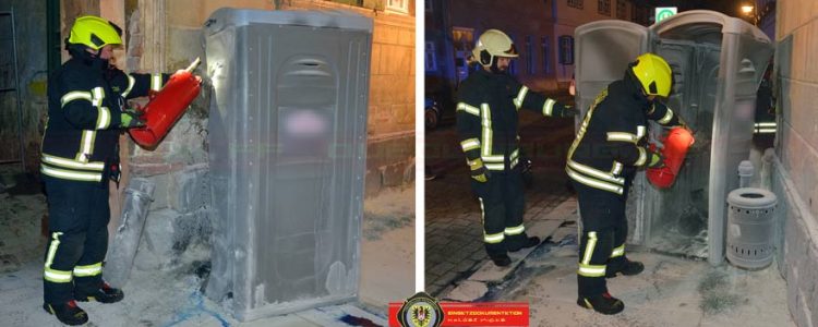 In der Weberstraße brannte eine mobile Toilette. Vor Eintreffen der Feuerwehr hatte die Stadtstreife die Flammen mit einem Pulverlöscher bereits erstickt. Mit der Kübelspritze wurden Nachlöscharbeiten durchgeführt.
