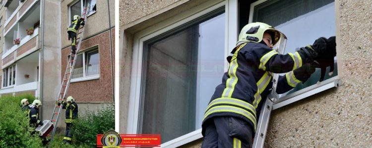 Da keiner zu Hause war, ging eine Kameradin über die Steckleiter zu der in einem angekippten Fenster hängenden Katze vor und hob sie nach oben aus dem Fensterspalt.