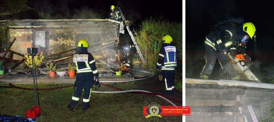 Zu einem Laubenbrand wurden die Ortsfeuerwehren Quedlinburg und Gernrode alarmiert. Vor Ort angekommen stand eine Laube in Vollbrand. Mit einem C-Rohr ging der Angriffstrupp unter schwerem Atemschutz zur Brandbekämpfung vor. Bei den Nachlöscharbeiten mussten Teile der Decke mit der Motorkettensäge geöffnet werden. Die Restablöschung erfolgte mit Schaum.