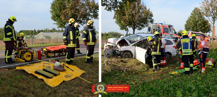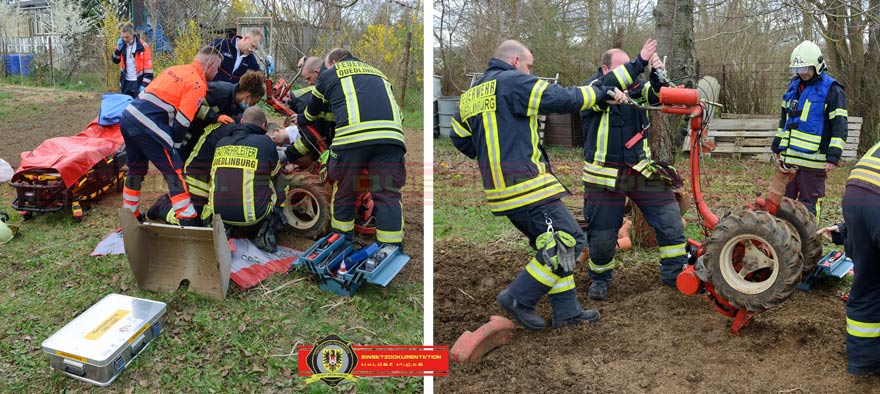 Bei Gartenarbeiten mit einer Motorhacke geriet der Gartenbesitzer mit dem linken Bein in das Messerwerk. Mit dem Handy konnte der allein im Garten arbeitende Mann den Notruf absetzen. Weiterhin rief er lautstark um Hilfe. Ein junger Mann wurde auf die Rufe aufmerksam und wurde zum Ersthelfer. Er stützte bis zur Befreiung den Oberkörper des Verletzten.