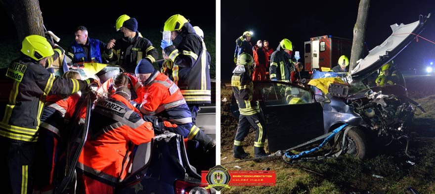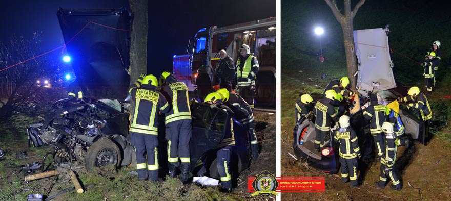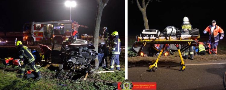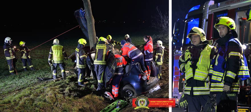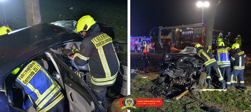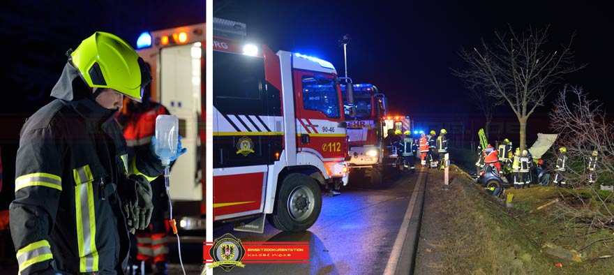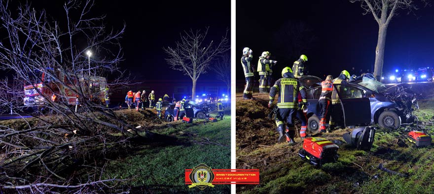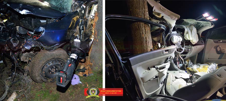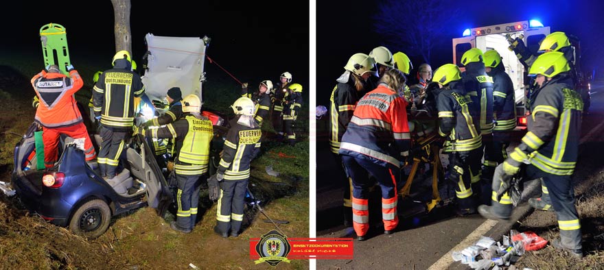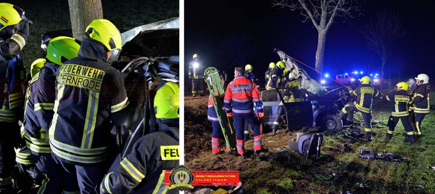 Aus unbekannter Ursache kam der Fahrer eines Pkw nach rechts von der Fahrbahn ab, fuhr frontal gegen einen Baum und schleuderte anschließend mit der Fahrerseite gegen einen weiteren Baum. Bei Alarmierung der Rettungskräfte befand sich das Tanklöschfahrzeug der Ortsfeuerwehr Quedlinburg gerade an der Tankstelle im Gernröder Weg von einem vorherigen Fehlalarm. Durch diesen Umstand traf die Feuerwehr bereits nach 2 Minuten am Unfallort, noch vor dem Rettungsdienst, ein. Ersthelfer betreuten bereits die zwei Insassen, wobei der Beifahrer bewusstlos und der Fahrer eingeklemmt war. Den Beifahrer zog der Angriffstrupp aus dem Fahrzeug und versorgte diesen bis zum wenig später eintreffenden Rettungsdienst. Komplizierter gestaltete sich die Rettung und Befreiung des im Fußraum eingeklemmten und ansprechbaren Fahrers. Mit Schere und Spreizer (parallel arbeitend Feuerwehr Gernrode und Quedlinburg) wurden das Dach, die hintere Fahrertür und die B-Säule des Pkw entfernt. Da sich der Baum im Bereich der Fahrertür in das Auto gedrückt hatte, wurde mit Hilfe des Spreizers das Fahrzeug vom Baum weggedrückt, um den Fußraum mit dem Hydraulikstempel zu weiten. Während dieser Arbeiten verschlechterte sich der Zustand des Fahrers und es wurde nach Absprache mit dem Notarzt eine Sofortrettung durchgeführt. 69 Minuten nach Alarmierung war der Fahrer befreit. Im Rettungswagen unterstützten mehrere Kameraden bei der Reanimation.