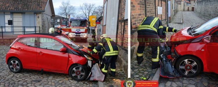 Beim verlassen des Parkplatzes in der Schenkgasse verlor die Fahrerin eines Toyota die Kontrolle über das Fahrzeug und fuhr gegen die gegenüberliegende Hauswand. Die zwei Insassen wurden dabei verletzt. Die Kameraden sicherten die Einsatzstelle und klemmten die Batterie des Pkw ab. Ein Hund der sich ebenfalls im Toyota befand wurde dem Tierheim übergeben.