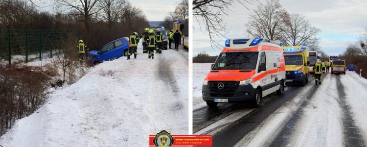 Auf schneeglatter Fahrbahn kam ein Pkw nach rechts von der Fahrbahn ab und landete im Straßengraben. Die Kräfte der Feuerwehr sicherten die Unfallstelle.