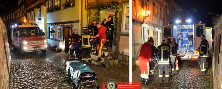 In einem Fachwerkhaus war eine Person gestürzt. Aufgrund der Enge und der schmalen Treppe im Gebäude war dort Muskelkraft gefragt. Daraufhin forderte der Rettungsdienst die Feuerwehr nach. Auf einer Vakuummatratze wurde die Patientin aus dem Haus transportiert und auf die vorbereitete Trage gelegt.