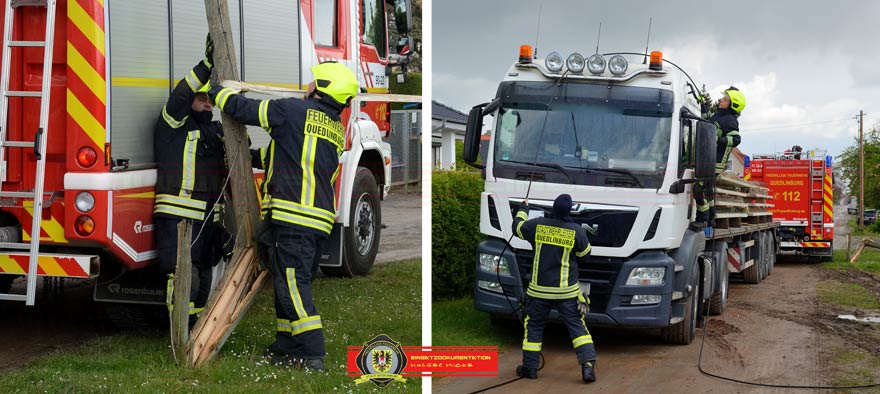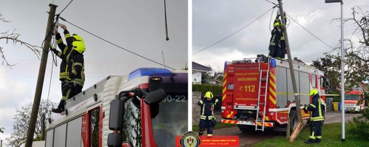 Beim rangieren eines Mobilkranes auf ein Grundstück wurde ein Telefonmast so stark beschädigt das dieser umzukippen drohte. Arbeiter sicherten den Mast provisorisch mit zwei Schlupfen. Der Angriffstrupp entfernte die Leitungen vom Mast und unterstützt durch den Wassertrupp konnte so der Mast auf dem Boden abgelegt werden.