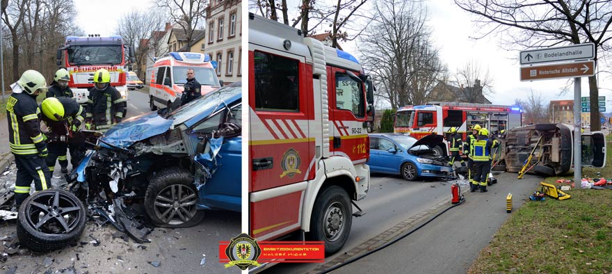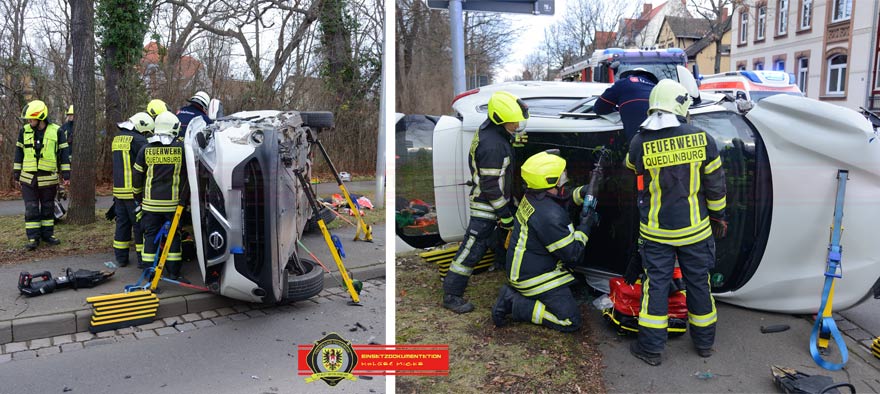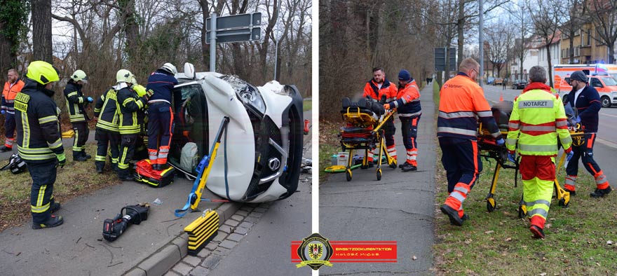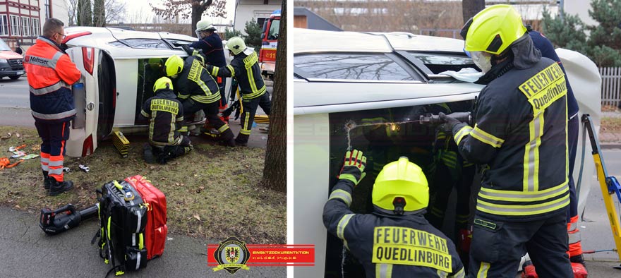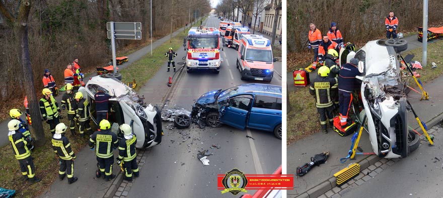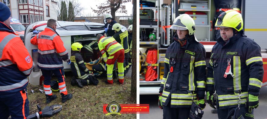 Zwei im Gegenverkehr fahrende Pkw stießen seitlich frontal zusammen. Ein Pkw kippte auf die Beifahrerseite. Bei Eintreffen der Feuerwehr befanden sich die zwei Insassen noch im Pkw und der Rettungsdienst betreute diese von außen. Der Fahrer des anderen Pkw war bereits im Rettungswagen. Nach einer Lageerkundung wurde als erstes der Pkw mit dem Stab-Fast-System gegen umkippen gesichert, die Löschbereitschaft hergestellt und die Einsatzstelle gesichert. Anschließend ging eine Kameradin, als innere Retterin, in das Fahrzeug und erklärte den ansprechbaren und leicht verletzten Frauen das Vorgehen der Kameraden außerhalb vom Fahrzeug. Da der Pkw ein Panorama Glasdach hatte, konnte dieses zeitnah mit dem Glasmaster und der Säbelsäge geöffnet werden. Mit Hilfestellung verließen die Verletzten selbstständig den verunfallten Wagen und wurden durch den in Bereitstellung stehenden Rettungsdienst übernommen.
