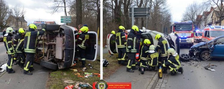 Zwei im Gegenverkehr fahrende Pkw stießen seitlich frontal zusammen. Ein Pkw kippte auf die Beifahrerseite. Bei Eintreffen der Feuerwehr befanden sich die zwei Insassen noch im Pkw und der Rettungsdienst betreute diese von außen. Der Fahrer des anderen Pkw war bereits im Rettungswagen. Nach einer Lageerkundung wurde als erstes der Pkw mit dem Stab-Fast-System gegen umkippen gesichert, die Löschbereitschaft hergestellt und die Einsatzstelle gesichert. Anschließend ging eine Kameradin, als innere Retterin, in das Fahrzeug und erklärte den ansprechbaren und leicht verletzten Frauen das Vorgehen der Kameraden außerhalb vom Fahrzeug. Da der Pkw ein Panorama Glasdach hatte, konnte dieses zeitnah mit dem Glasmaster und der Säbelsäge geöffnet werden. Mit Hilfestellung verließen die Verletzten selbstständig den verunfallten Wagen und wurden durch den in Bereitstellung stehenden Rettungsdienst übernommen.