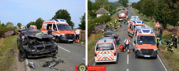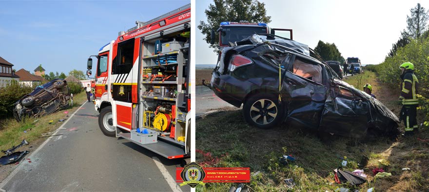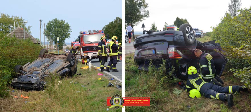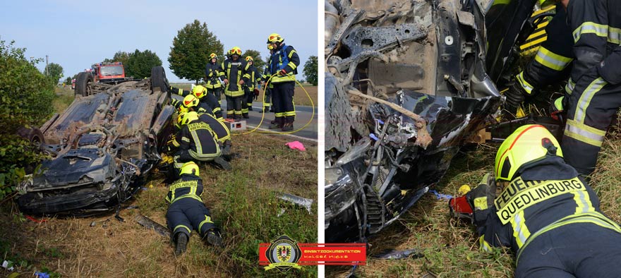 Bei einem Überholversuch in einer Rechtskurve verlor der 60-jährige Fahrer eines Subaru die Kontrolle über sein Fahrzeug, geriet in den Gegenverkehr und kollidierte dort mit einem BMW. Ein dahinter fahrender VW konnte nicht mehr ausweichen und fuhr in die Unfallstelle. Der Subaru überschlug sich und blieb auf dem Dach im Graben liegen. Der Fahrer wurde aus dem Fahrzeug geschleudert. Ein umher fliegendes Rad traf einen Skoda auf dem Dach. Die vier Insassen blieben unverletzt. Ersthelfer befreiten die zwei Insassen aus dem BMW über die Heckklappe. Bei Eintreffen der Ortsfeuerwehr Quedlinburg betreuten Kameraden der Ortsfeuerwehr Ditfurt mehrere verletzte Personen und der Rettungsdienst reanimierte eine Person im Straßengraben, ohne Erfolg. Da in dem auf dem Dach liegenden Pkw ein Kindersitz war und nicht ausgeschlossen werden konnte das sich darin ein Kind befand, wurde die Umgebung der Unfallstelle abgesucht. Parallel wurde mit zwei Spreizern der Pkw angehoben und mit der Wärmebildkamera unter dem Subaru abkontrolliert. Zum Glück ohne etwas zu finden. Abschließend drehte man den Pkw mit Hilfe der Winde vom HLF wieder auf die Räder. Insgesamt wurden bei dem Unfall vier Personen verletzt.