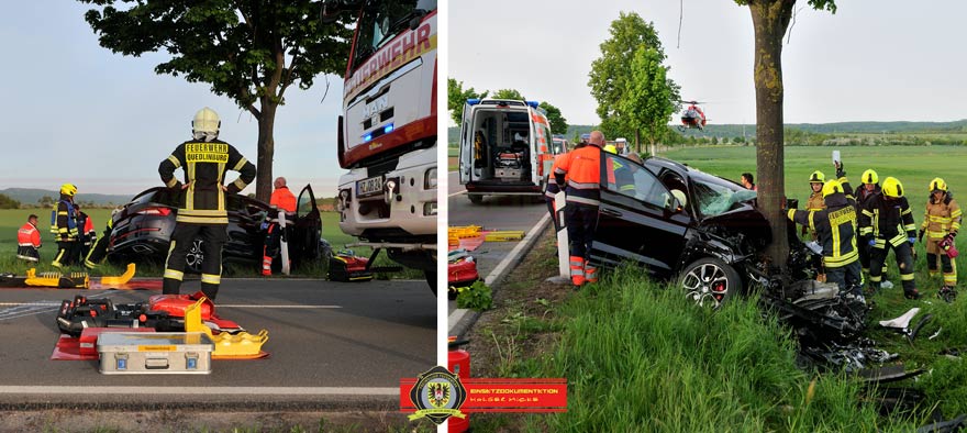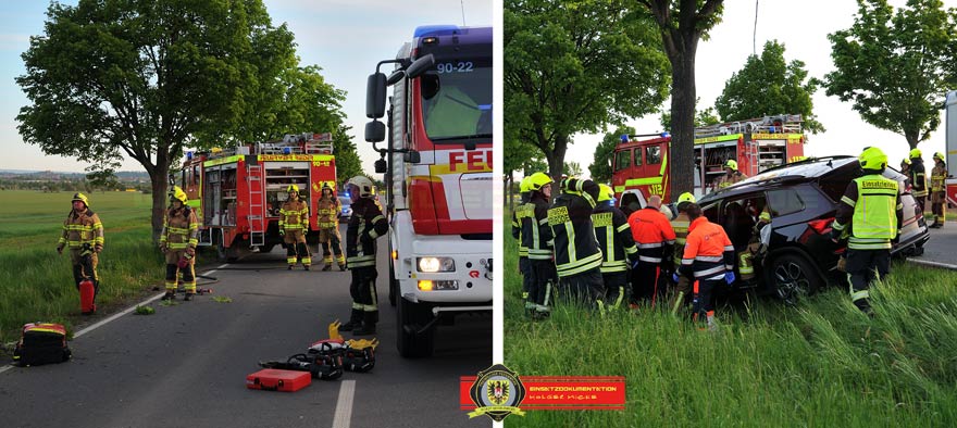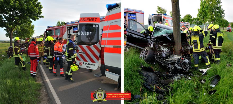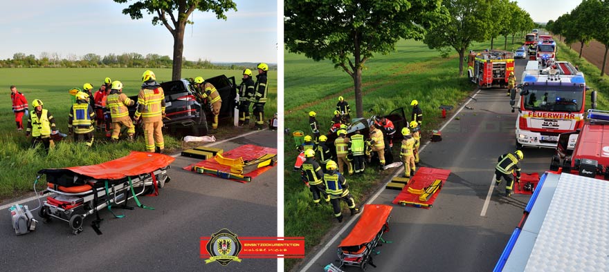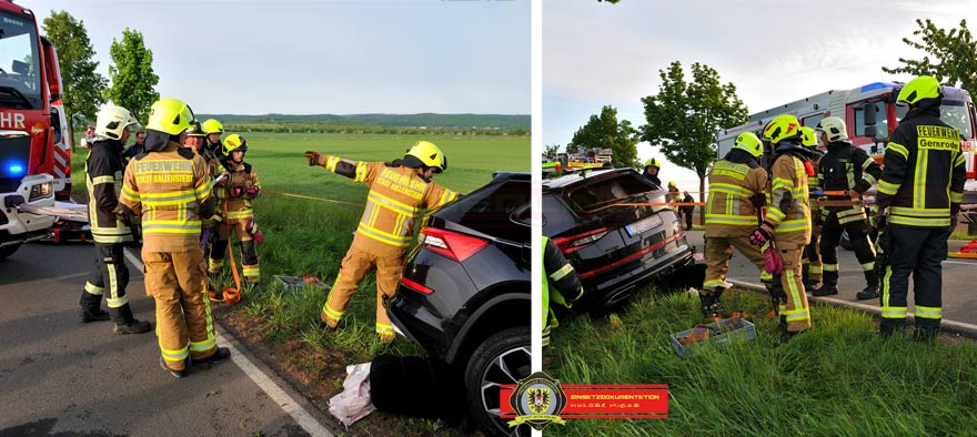 Bei Eintreffen der Feuerwehren aus Gernrode, Rieder und Quedlinburg war der Fahrer in seinem Fahrzeug eingeklemmt. Ersthelfer darunter ein Kamerad aus Gernrode betreuten den ansprechbaren Verunfallten. Nach einer Lageerkundung und in Absprache mit dem Notarzt wurden die Türen der Fahrerseite mittels hydraulischen Rettungsgerät entfernt. Schwieriger gestaltete sich die Erweiterung des Fußraumes wo die Beine eingeklemmt waren. Mit Spreizer und Rettungszylinder wurden im inneren des Skoda Stück für Stück die deformierten Bauteile von den Füßen weggedrückt. Parallel legte man einen Schlupf um den Fahrersitz, befestigte diesen über einen Ratschengurt am TLF von Gernrode und versuchte den Sitz nach hinten zu ziehen. Die elektrische Sitzverstellung war durch den Aufprall nicht mehr möglich, deshalb musste improvisiert werden. Wenige Zentimeter reichten aus und der Verunfallte konnte 55min nach der Alarmierung aus dem Pkw gerettet werden. Nach Stabilisierung des Patienten wurde dieser mit einem Rettungshubschrauber in eine Klinik geflogen.